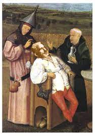 Adapted from The Cure of Folly by Hieronymus Bosch, ca. 1475, now at the Museo del Prado, Madrid.