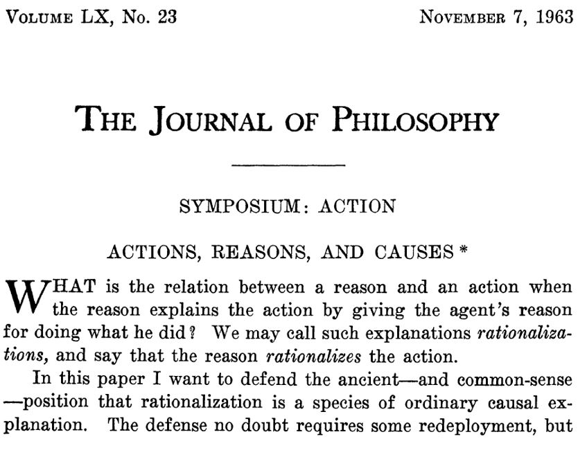 In “Actions, Reasons, and Causes” (1963) Donald Davidson famously argued that actions are both ‘rationalized’ and caused by the agent’s reasons. Here is the tritest illustration of this “standard account” of actions: When Brett wants a beer and believes there is beer in the fridge, this gives him a reason to open the fridge and causes him to do so. The usual interpretation of such a case is that, when Brett opens the fridge to take a beer, he does so as the practical conclusion of a syllogistic inference, the two premises of which are his desire for a beer and his belief that there is beer in the fridge. Taken jointly these two premises constitute Brett’s reason for opening the fridge (this is a simplified description, of course, but here it will do).