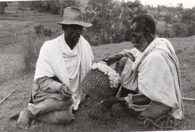 This picture, taken in 1969, shows two Dorze elders discussing how to interpret the entrails of a lamb that had just been slaughtered.