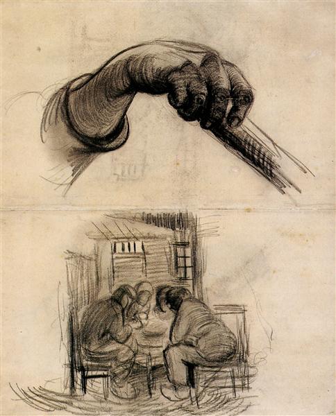 Hand with a Stick, and Four People Sharing a Meal (Vincent van Gogh, 1885)