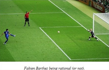 What of the penalty kickers? Are they more ‘rational' in their choices than the goalies? According to the observation of the Bar-Eli team, the optimal behavior for a penalty kicker is to target the upper third of the goal. In the sample they analyzed, not a single kick in this part of the goal was stopped, as compared to 30% in the central third and 57% in the lower third. So, do the kickers consistently aim at the higher third? No. Why? Because the way of failing varies, and seems to be more important than the actual rate of failure. When the kicker targets the lower third, most failures will come from the goalkeeper having stopped the ball, an ‘honorable' defeat, brought about by the goalie's skills. On the other hand, when the kick is aimed at the upper third, most failures will come from kicks that miss the goal altogether. In such cases, the kicker only has himself to blame. And everybody else only has the kicker to blame. In this light, it makes sense that the kickers should act in a way that is going to minimize reproach rather than only the chances of missing.