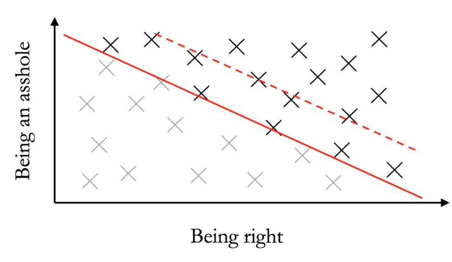 Here, everything that is below the red line doesn’t get said: there are ideas that might be right, but are held by very nice and shy people (bottom middle), the ideas of people who don’t care so much about what others think, but that are held with too little confidence (left middle), and the idea held with little confidence by shy people (those least likely to be voiced, bottom left).