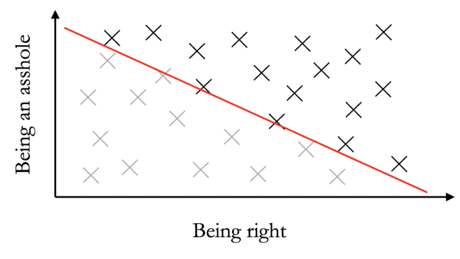 Each cross is a controversial thought in someone’s mind. There’s no reason to expect less agreeable people to be less likely to form accurate thoughts—they’re assholes, not idiots. That’s why there’s no correlation between the two dimensions. In particular, assholes (people on top of the graph) aren’t more likely to form ideas that are right or wrong than nice guys (at the bottom).