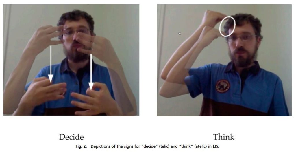 "According to a theoretical tradition dating back to Aristotle, verbs can be classified into two broad categories. Telic verbs (e.g., “decide,” “sell,” “die”) encode a logical endpoint, whereas atelic verbs (e.g., “think,” “negotiate,” “run”) do not, and the denoted event could therefore logically continue indefinitely. Here we show that sign languages encode telicity in a seemingly universal way and moreover that even nonsigners lacking any prior experience with sign language understand these encodings. In experiments 1–5, nonsigning English speakers accurately distinguished between telic (e.g., “decide”) and atelic (e.g., “think”) signs from (the historically unrelated) Italian Sign Language, Sign Language of the Netherlands, and Turkish Sign Language. These results were not due to participants' inferring that the sign merely imitated the action in question. In experiment 6, we used pseudosigns to show that the presence of a salient visual boundary at the end of a gesture was sufficient to elicit telic interpretations, whereas repeated movement without salient boundaries elicited atelic interpretations. Experiments 7–10 confirmed that these visual cues were used by all of the sign languages studied here. Together, these results suggest that signers and nonsigners share universally accessible notions of telicity as well as universally accessible “mapping biases” between telicity and visual form."