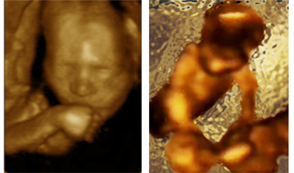 Left: self-directed movement towards the mouth Right: the foetus "caressing" the head of the sibling.