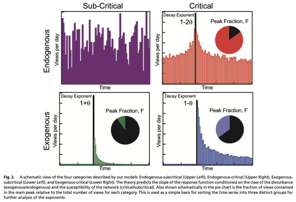 Endogenous subcritical: the dynamic of daily views of 90 % of videos cannot be distinguished from random processes by the model because they do not result in peak activity, they do not become hot topics at all. Exogenous subcritical: some videos experience peak activity because of external factors (such as advertising for instance) but are not worth the attention. The number of their daily views decreases rapidly. Endogenous critical: some Youtube videos get the attention of Youtube users, their reputation progressively grows and they become a major topic for some time. Exogenous critical: some other videos have a burst of activity linked to some external factor and then spread like epidemics. After an initial burst, their activity decrease slowly.
