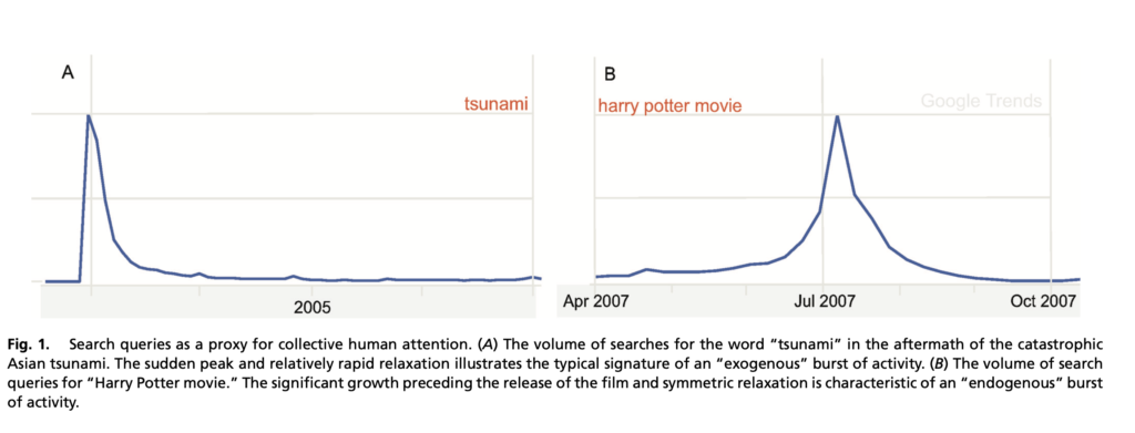 Hot topics dynamics differ quite sharply depending on whether the spread of information is linked to endogenous or exogenous causes. Here is an example of an endogeneous event. In the summer 2007 you may have heard about the forthcoming Harry Potter movie Harry Potter and the Order of the Phoenix through some friends, news in the media, or other sources and somehow, because it was expected by many, news and conversations progressively came to turn a lot around Harry Potter. Alternatively, in winter 2005, no one was expecting a Tsunami and suddenly it became the most important topic of conversation. This is an exogenous event. Both events are associated with a sudden burst of activity but their generation involves quite different mechanisms, as shown in the Figure below. Endogenous events are associated with a progressive increase before the peak and a progressive decrease afterward (the graph looks almost symetrical). On the opposite, exogenous events experience a brutal increase of activity and a progressive decrease after the peak. Using Crane and Sornette's model, the upcoming of Harry Potter's movie would have been predictable but not the tsunami obviously.
