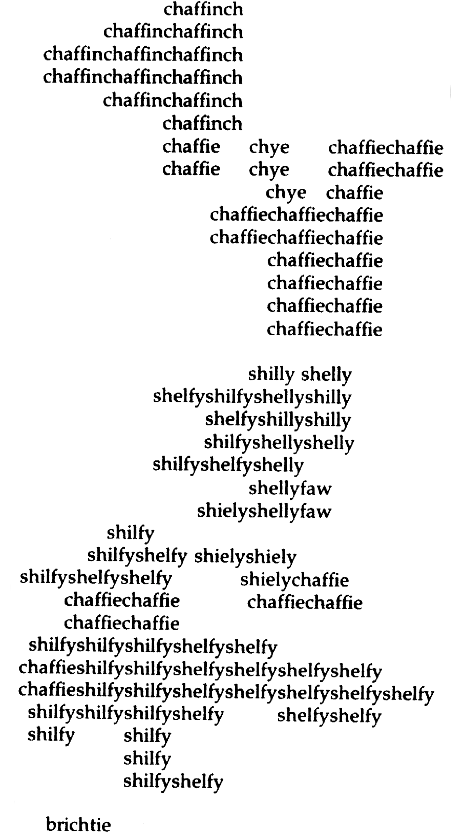 "The chaffinch is "a most common of European finch species is noted for its powerful and typical song. Chaffinches have an innate ability to sing, but also adapt to the songs of ‘teachers’ in their vicinity. This explains the curious incidence of regional variation in their song, a trait their song shares with human speech. This poem is a map of Scotland, or at least those areas in Scotland where the chaffinch is endemic. It shows the different names used in Scottish dialects for chaffinch, varying from chaffinch in the north over shielyfaw in the middle to britchie." (Strange Maps).