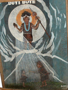 The second painting depicts Doyi Bote, today considered as a paternal figure living in the sky, projecting a beam on common people. Here, the costumes are closer to local reality. The beam might be borrowed from some Christian representation of mercy while the open hand is the classical gesture of protection (abhaya mudra) in Hinduism and Buddhism (see below).