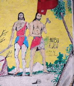 The first painting shows Nibo and Robo, the two apical ancestors, with what clearly looks like prehistoric attire (and which obviously has no equivalent in the local dresses and tools). I suspect the inspiration might be found in a globalized representation of the "ancestors" carried both by schoolbooks and TV programs like Discovery Channel or National Geographic, which are accessible in many villages nowadays.
