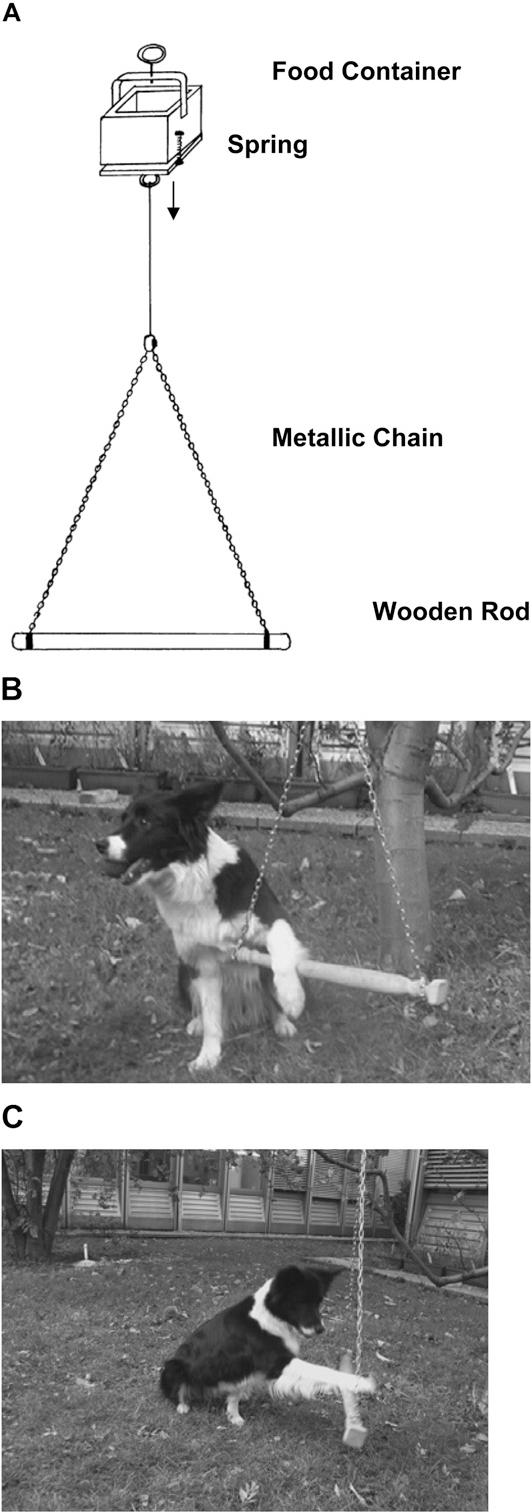 They used an apparatus that could be used by a dog to release a food reward by either pulling a wooden rod with its mouth or pushing it down with its paw (Figure A). They trained a domestic dog to push the rod with its mouth: the trained dog then served as a model. They divided a population of naïve domestic dogs into two conditions: the mouth-occupied condition and the mouth-free condition. In the former condition, after communicative cues from both humans and the model dog, the naïve dogs saw the model use its paw to push the rod with a ball in its mouth (Figure B). In the latter condition, after communicative cues from both humans and the model dog, the naïve dogs saw the model use its paw to push the rod while its mouth was empty (Figure C). Range et al. (2007) found that more than 80% domestic dogs reproduced the paw action in the mouth-free condition and only slightly more than 20% reproduced the paw action in the mouth-occupied condition.