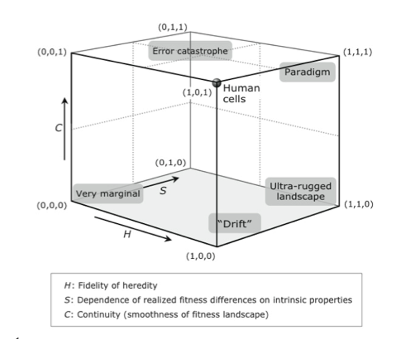 But should we go on talking about whether or not a phenomenon is “Darwinian”? Some think the term gets in the way, since we are seldom if ever alluding to what Darwin himself thought, but rather to the neo-Darwinian, post-DNA synthesis, itself an evolving landmark. On the other hand, there is general agreement within the group that some important elements of human culture evolve by processes strongly analogous to genetic natural selection, and the variations in these processes can be usefully diagrammed using Peter Godfrey Smith’s “Darwinian spaces” (See figure 1 for an instance), in which the similarities and differences can be arrayed in three dimensions. Since, moreover, there is agreement that these cultural regularities can set selection pressures (e.g., a “cultural niche”) for co-evolutionary processes, generating genetic responses (such as adult lactose tolerance), a unified evolutionary perspective, in which the trade-offs between cultural and genetic evolution can be plotted, is a valuable organizer of phenomena, some “more Darwinian” than others. No other term suggests itself for the set of features that mark paradigmatic (neo-)Darwinian phenomena, so perhaps the misunderstandings the term tends to generate can be deflected.
