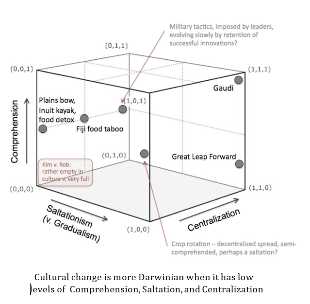 Spatial representations. Modifying Dan's initial chart, in my space I had three axes: comprehension, centralization, and saltation. Culture is more Darwinian when it has low values of all three. (And though there are plenty of populational and evolutionary processes that are not Darwinian, I think the chart captures something about the viability of evolutionary views of culture in a broader sense, too.)