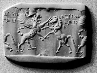 Modern impression on clay of Achaemenid cylinder seal, 5th. cent. BCE. A winged solar disc legitimises the Persian king who subdues two rampant Mesopotamian lamassu figures. (Credit: Hjaltland Collection. CC BY-SA 3.)