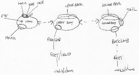 What these observations suggest is that composites are built according to a basic body plan. This schematic animal body plan appears to be organized in terms of a hierarchical organization of functionally differentiated morphological parts. Some features are subordinate to others, such as eyes always figuring on heads but never the opposite. Others can be understood as being set at the same level, such as eyes and mouths both figuring on heads, or heads and torsos serving as two superordinate body parts (see drawing below). Creating composites seems to obey the following general rule: when using a body part of an animal to assemble a composite, the location of the part in in the composite must be the same as in the original animal’s body plan. Heads are accordingly exchanged with heads, forelimbs with forelimbs, etc. Superordinate parts such as heads typically bring with them the transfer of their subordinate parts (e.g. eyes). However, subordinate parts can be transferred independently of their superordinate system (e.g., you can exchange feet for paws while keeping human legs, as in the two first composites depicted above).